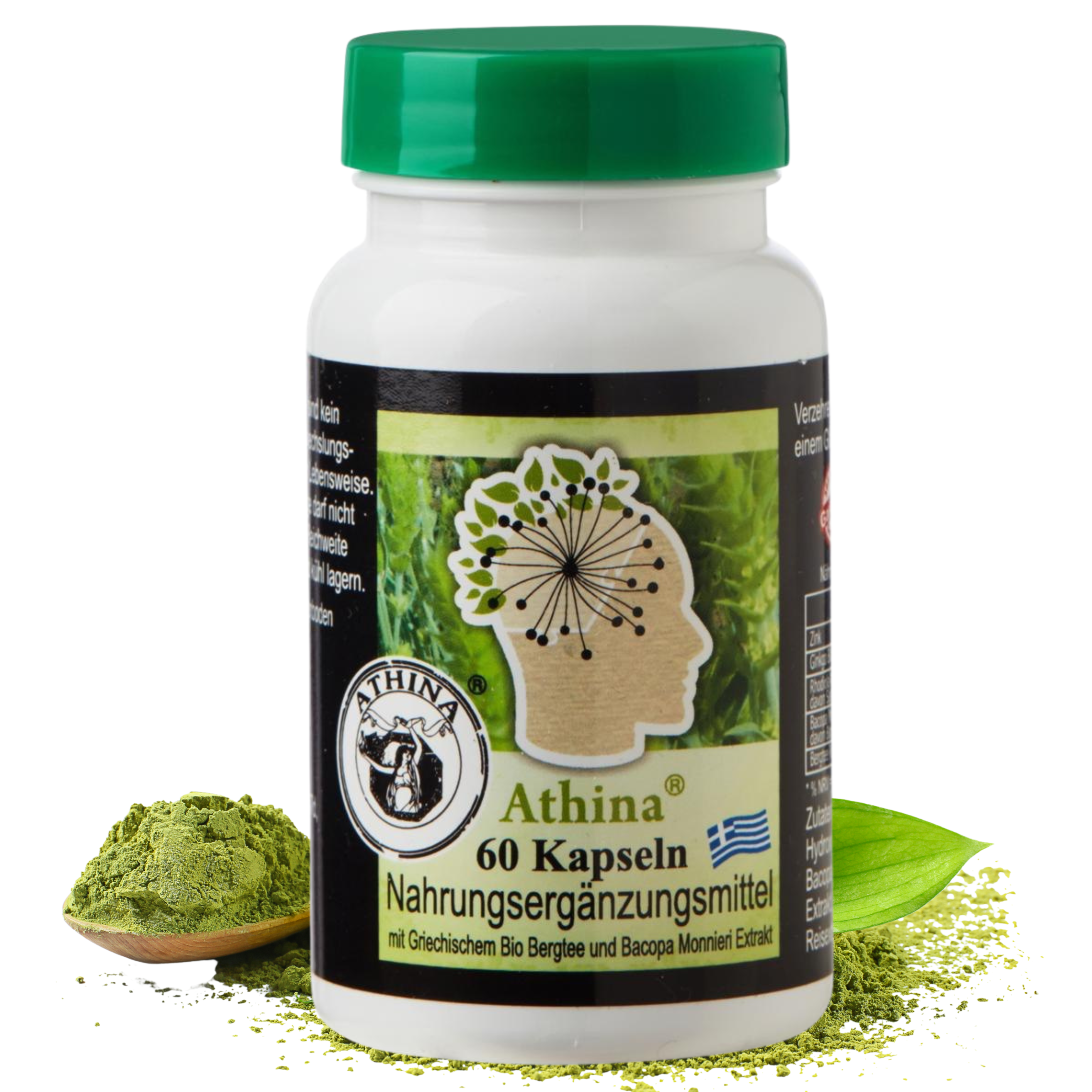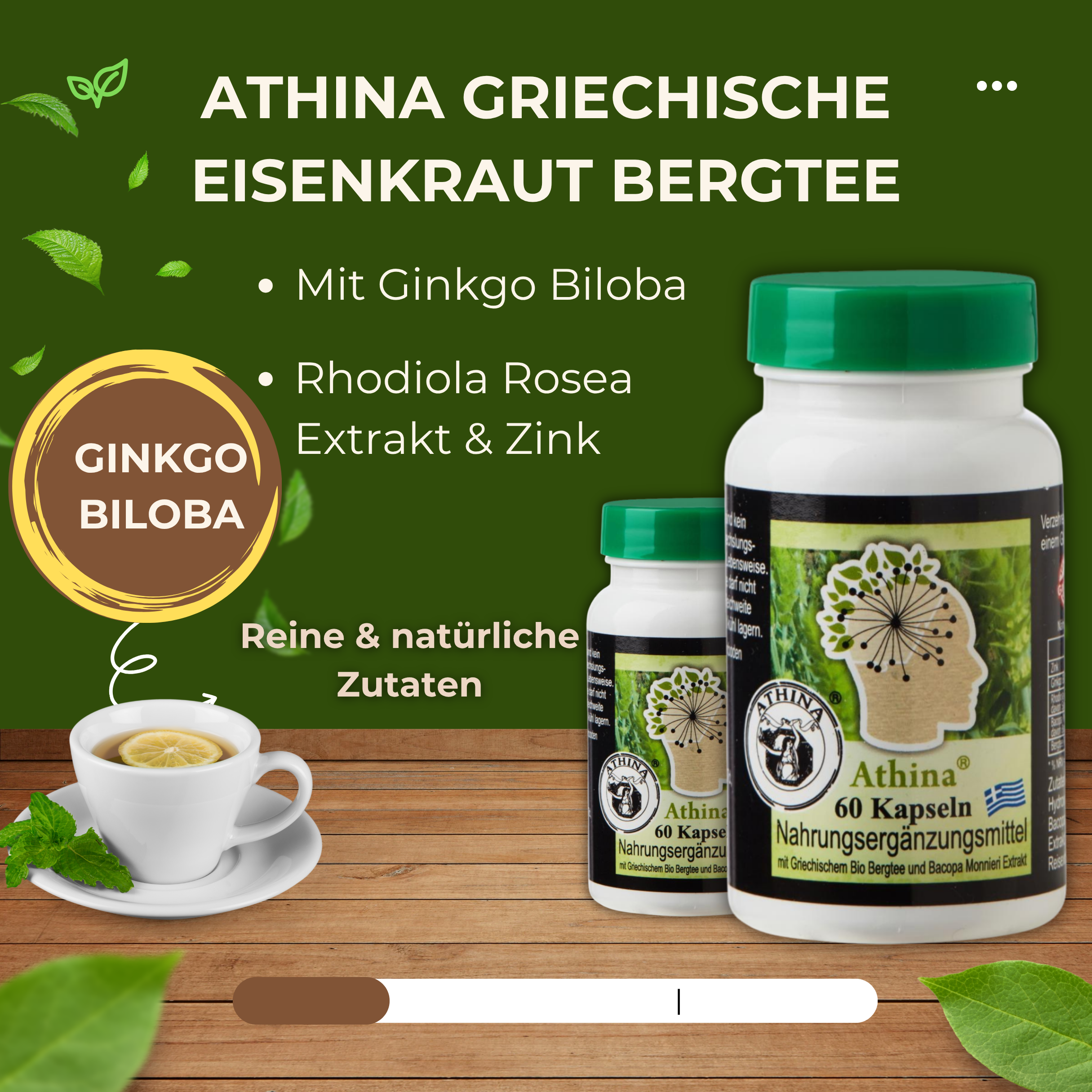 Athina® Griechische Eisenkraut Bio Bergtee Kapseln mit Bacopa Monnieri Extrakt. Mit Ginkgo Biloba + Rhodiola Rosea Extrakt.